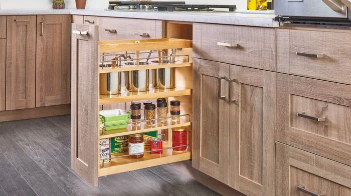 Through Choice Cabinet’s partnership with Rev-a-Shelf, cabinet interiors can also be configured to suit. Rev-a-shelf makes high-quality organizers like lazy Susans, kitchen utensil inserts and pantry organizers, trash pullouts, spice racks, cutting boards, lattice wine racks and so much more.