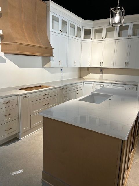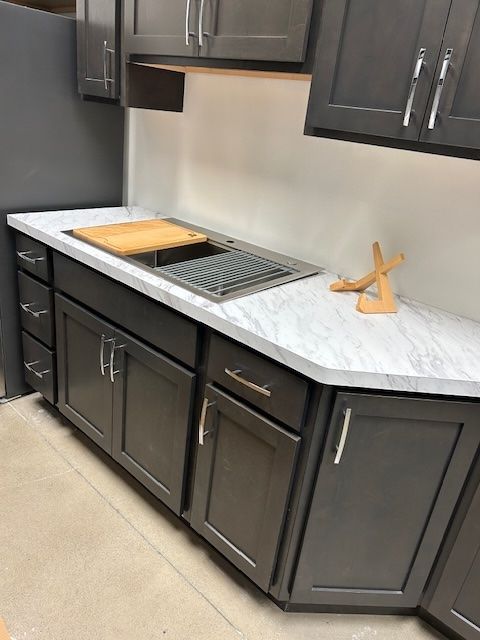 Beyond cabinets, Choice Cabinet offers countertops, faucets, sinks by Karran, wood stove hoods and even matching floating shelving to complete the look of your new kitchen.