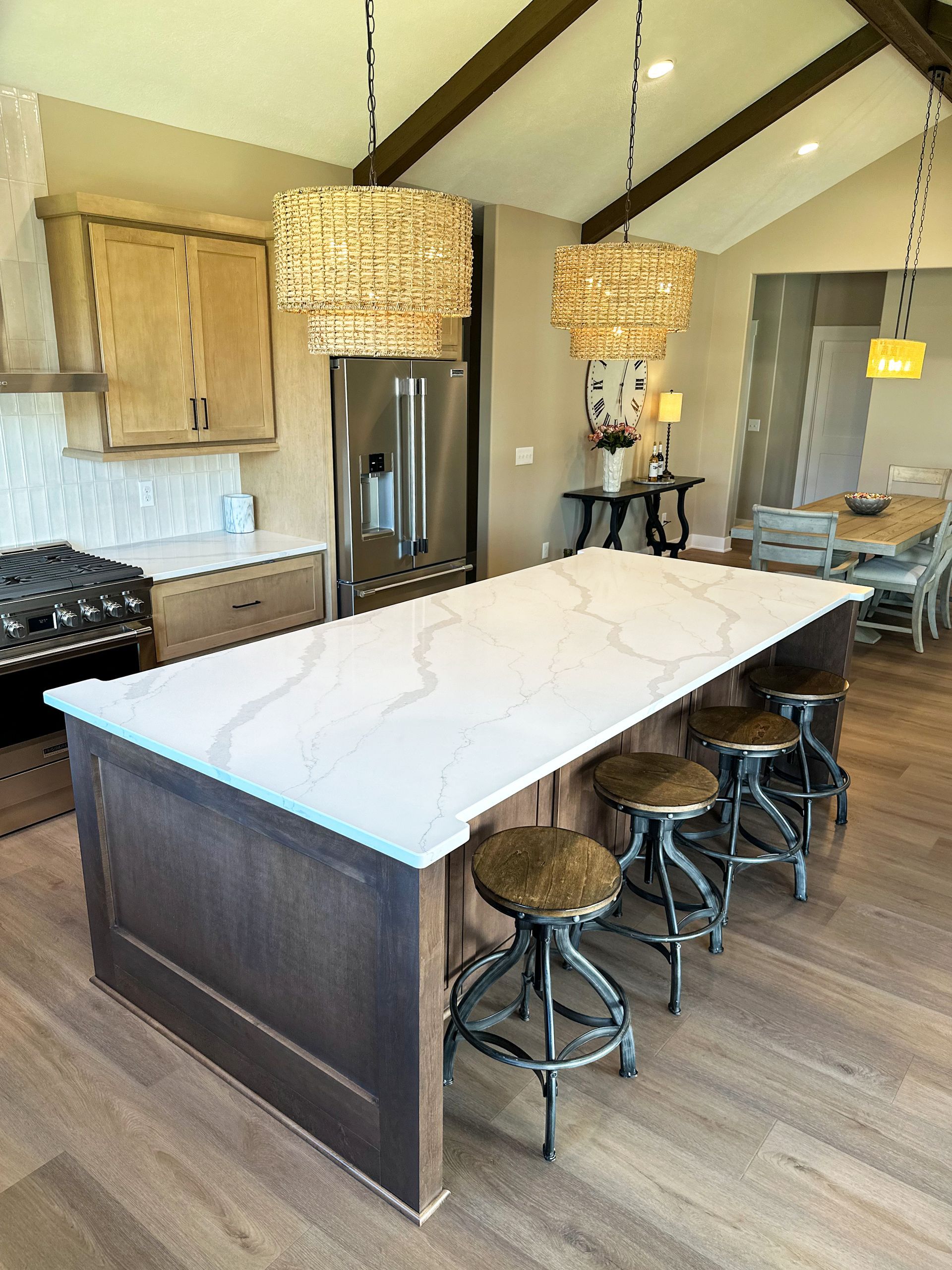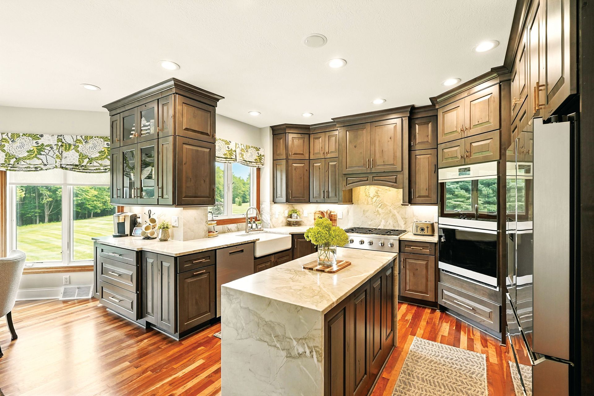 The countertops and the full-height backsplash in this kitchen are the work of the family-owned Chippewa Stone. With a “waterfall” countertop on the center island flowing to the floor and counter-to-cabinet stone backsplashes, the on-trend kitchen checks all the boxes for in-demand design.