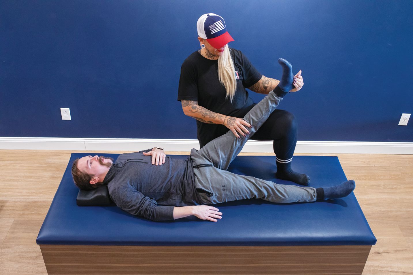 Flexologists have a fitness and health background before beginning a three-tiered certification process that includes 60 hours of in-person workshops and 20-plus hours of hands-on training administering the 26 signature StretchLab stretches.