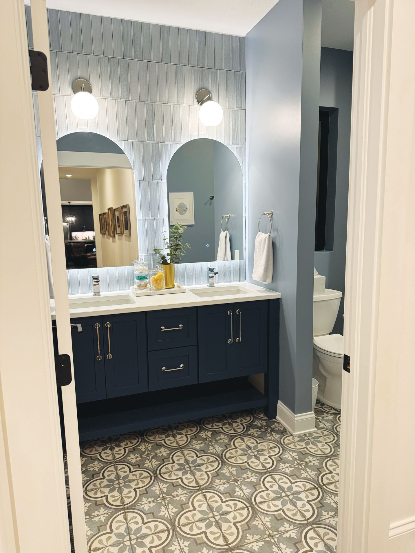 “We have been color drenching bathrooms in dark, moody hues and layering wallpapers in monochromatic colors to create a cohesive, dramatic look,” Kristen says. “These bold choices can actually make a small bathroom feel bigger.”