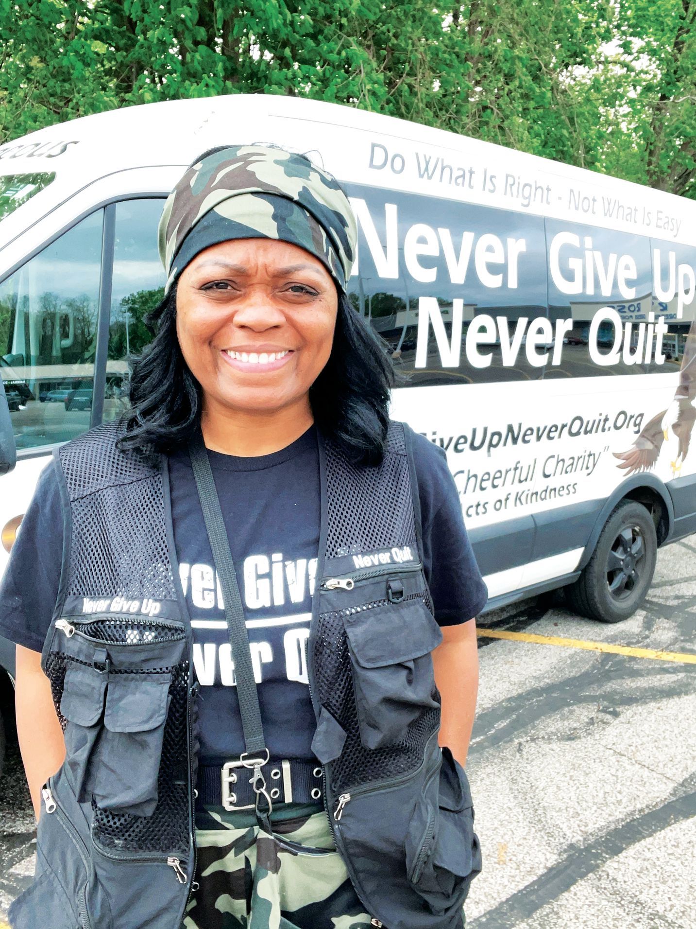 Sharon is also the founder of the 501(c)(3) charity Never Give Up, Never Quit, an organization established on the principle that a little act of kindness can go a long way. She does this by traveling with volunteers in a van filled with gifts that she hands out to people, hoping the sweet gesture will give those who need it the push to keep going. Sharon knows that this is her assignment in life. It may be small, but the impact is huge. She shows up in places like shopping center parking lots and stands outside the van, handing out everything from t-shirts to wristbands to butterfly clips. “I turn on music and ask people if they would like a random act of kindness,” Sharon says.