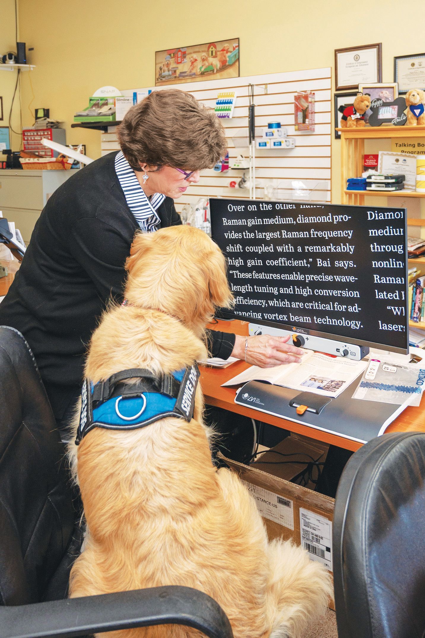 Founder Debbie Kogler opened the store in 2002. Over the years she’s grown the staff to include technicians who consult with people to assess their needs and connect them to the latest products. Visitors to the store will find hand-held magnifiers, video magnifiers, talking watches, CCTV reading machines, reading lamps, Braille equipment, glare control glasses and items help with activities of daily living. They’ll also enjoy a visit with Jeffrey, who is CFO (canine fun officer). This sweet-natured golden retriever is a trained Leader Dog for the Blind and adept at working with the visually impaired.