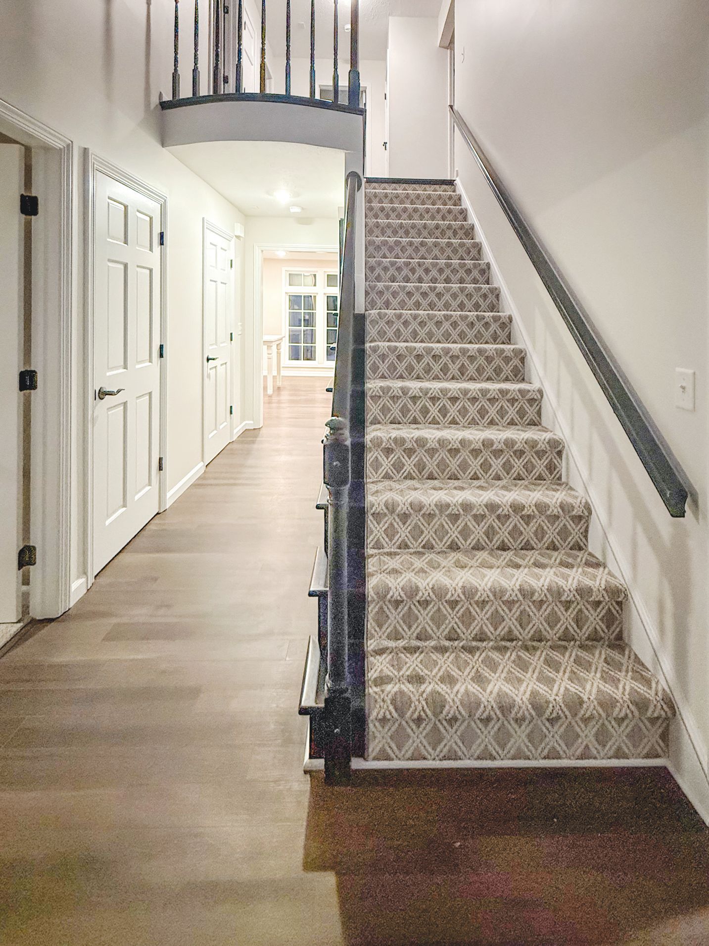 “We also injected a bit of fun with a patterned runner going up the stairs (Stanton Rapture), which provided a counterpoint to the dark wood-look luxury vinyl plank (Au Naturel in Kona from Stanton), which come in 4-inch planks for a classic look,” she says. “The homeowner was willing to create some drama in this transitional esthetic, including going with barely-there blue grass cloth wallpaper in the half bath. The owner favored a country club vibe, so we created a plaid pattern with mosaic floor tiles in this room that turned out distinctive.”