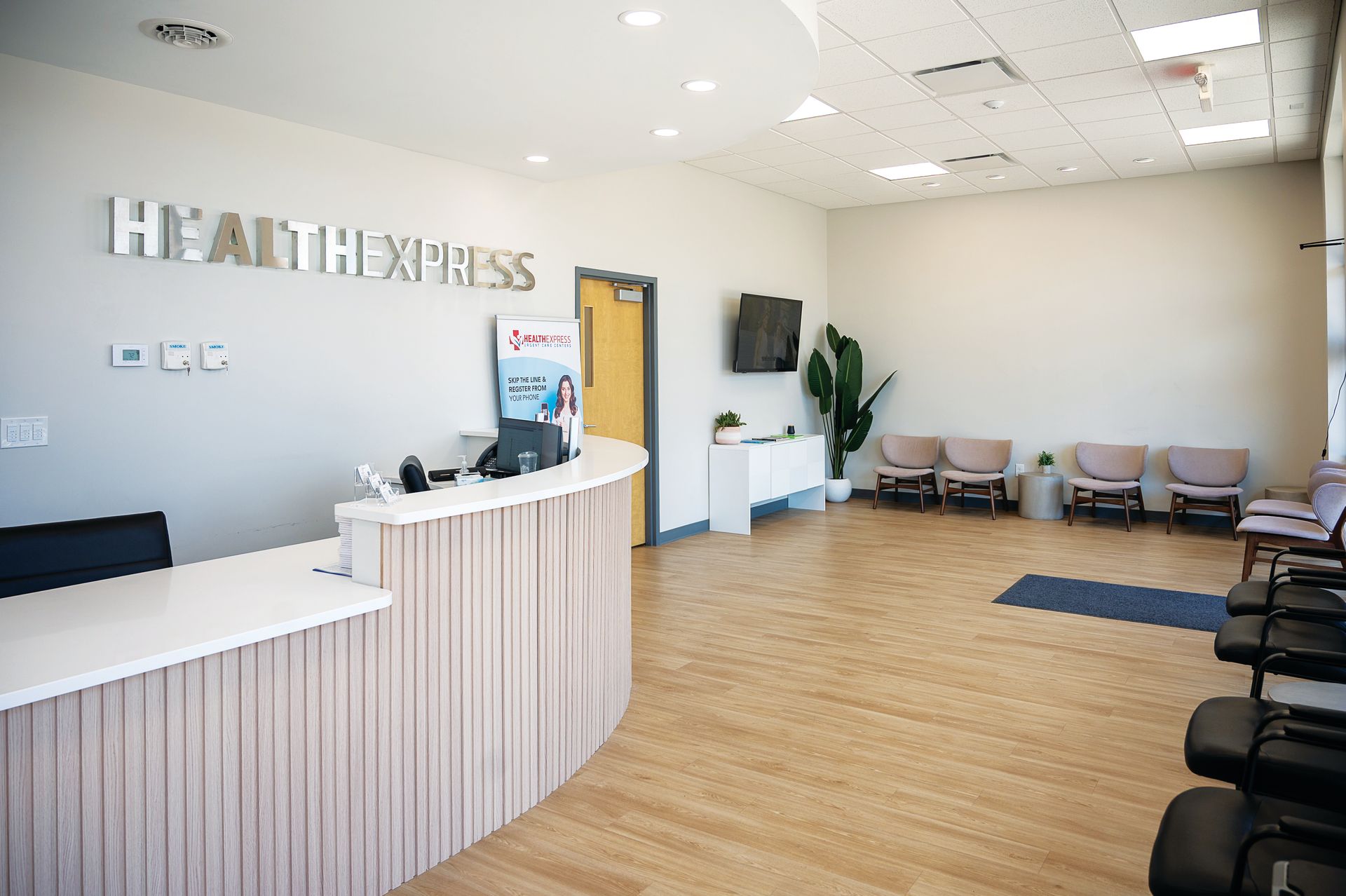 Inside HealthExpress, no one sits behind a sliding glass window. You’re greeted at an open counter in a bright, spacious waiting area. There’s no clipboard or pen on a string. That’s because you can register online ahead of time or simply scan the QR code in the lobby.