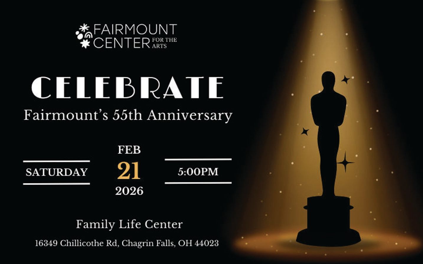 - What: Fairmount Center for the Arts 55th Anniversary Celebration—A Night in Hollywood