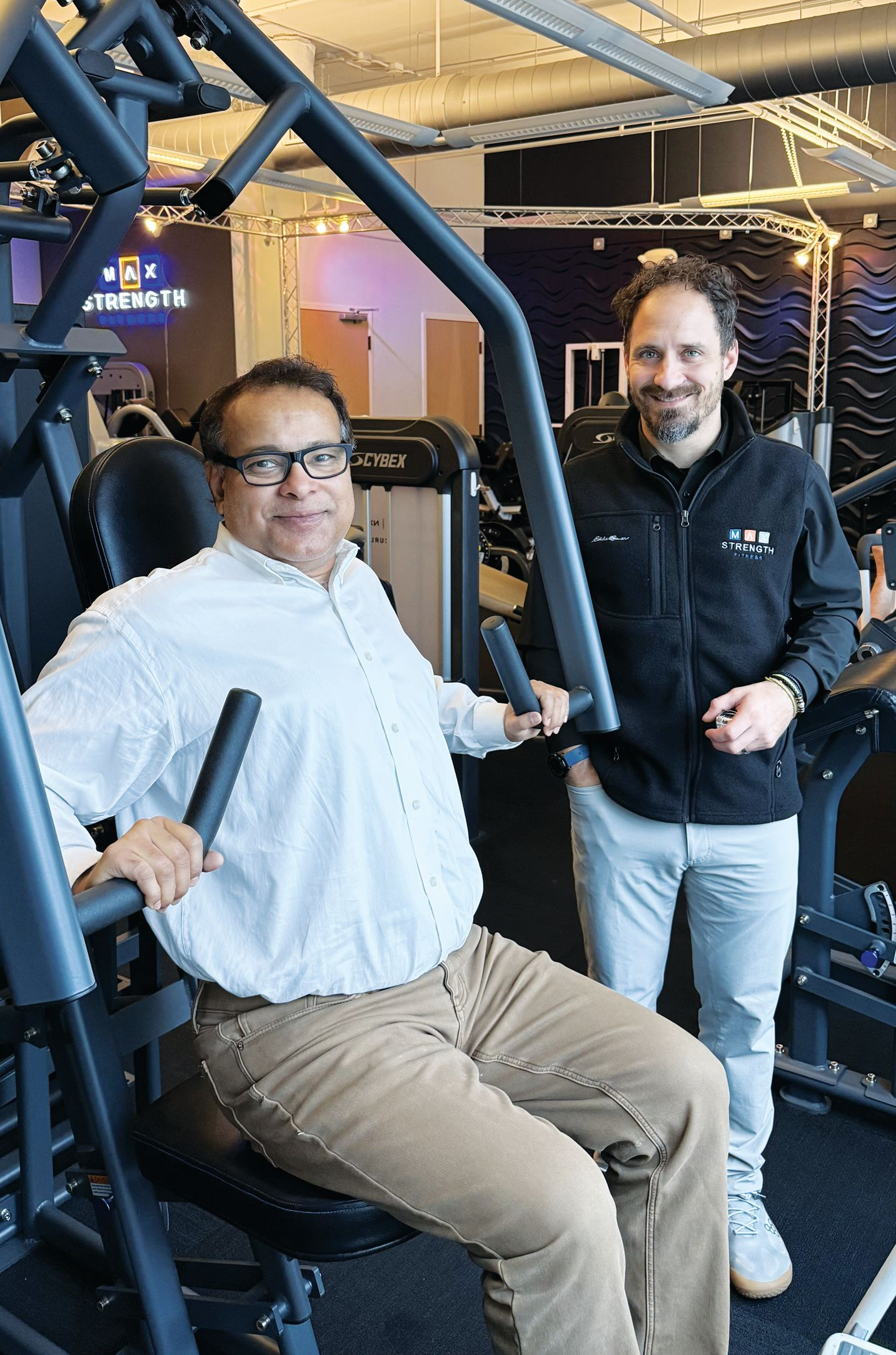 MaxStrength Fitness’s science-backed methodology that favors shorter, more intense workouts on specialized equipment appealed to local physician Dr. Mushtaq Mahmood. He’s pictured with MSF Trainer Dominic. (Photography: Adrienne Rose)