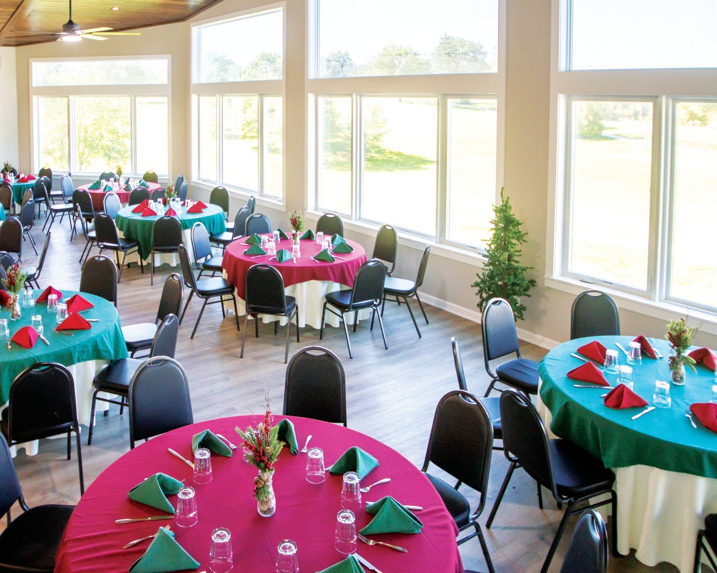 “It’s a breathtaking venue with a panoramic view of the golf course,” Chad emphasizes. “It holds up to 160 people. It’s the ideal place to hold Christmas parties and other get-togethers, partly because we do all the work. You can do a brunch, open gifts and enjoy each other’s company without having to worry about cooking and cleaning up.”